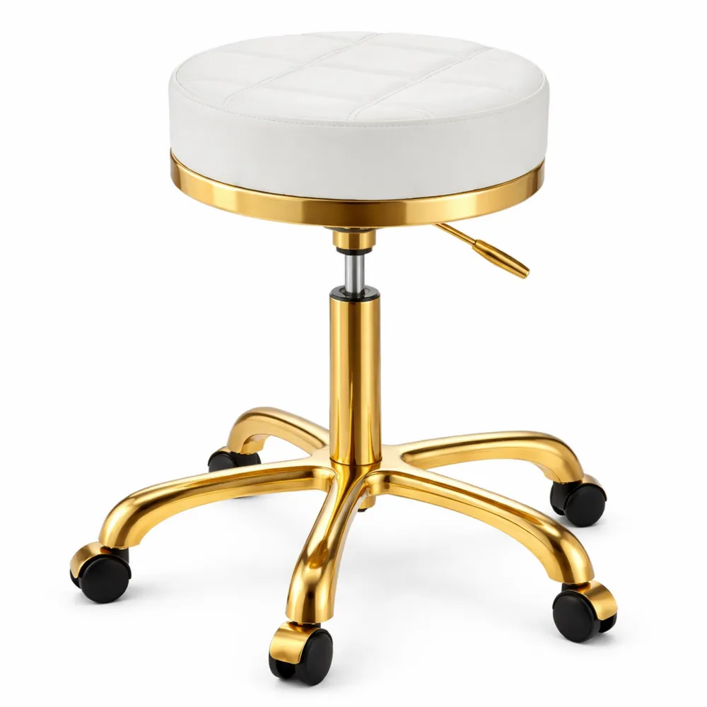 Sgabello girevole professionale, con seduta in similpelle bianca e base dorata. Altezza regolabile e ruote per mobilità, ideale per saloni di bellezza, spa o uso domestico.